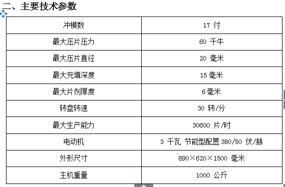 3:本機(jī)壓力大,壓片片徑大,能壓制普通,異型,環(huán)形等多種形狀片劑,特別適合多品種,小批量生 產(chǎn)。